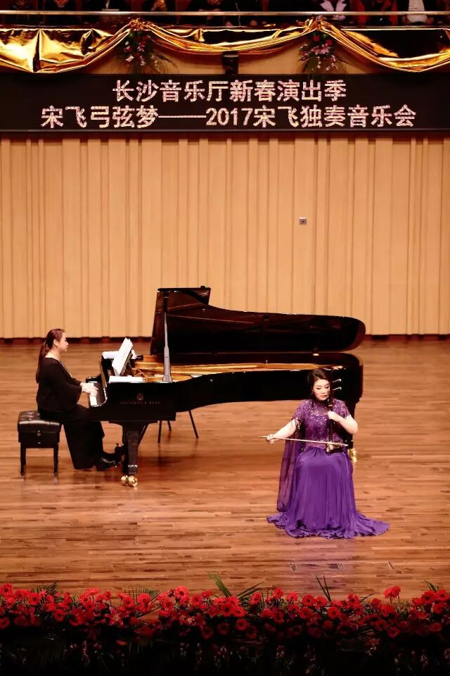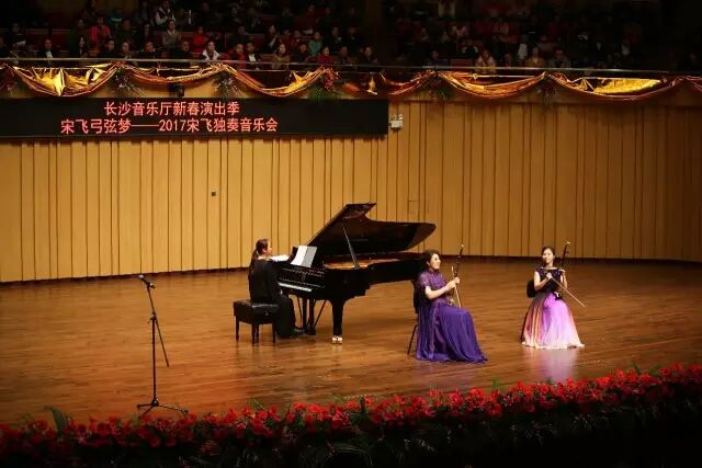 演出当晚,高贵典雅的宋飞教授一出场,期盼已久的观众朋友们即报以雷鸣般的掌声,向这位民乐大家表达了湖南人民最最热烈的欢迎!宋飞教授回以观众们亲切的问候,邀请钢琴演奏家原丁老师,携弟子黄晓晴联袂演奏了两首二胡经典名曲《葡萄熟了》与《乔家大院》之“爱情”,开启了本场音乐会的序幕。观众沉浸于宛若天籁的诗意魅音中,雷鸣般的掌声此起彼伏。