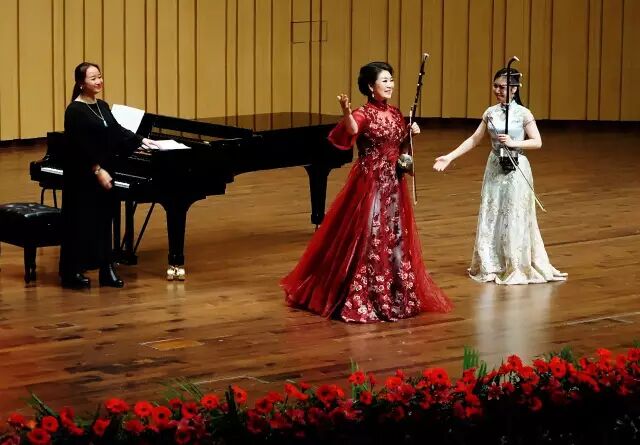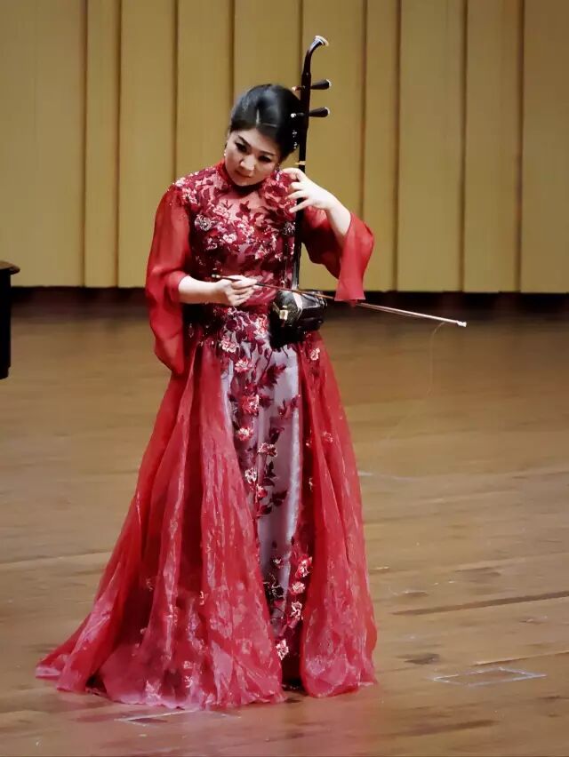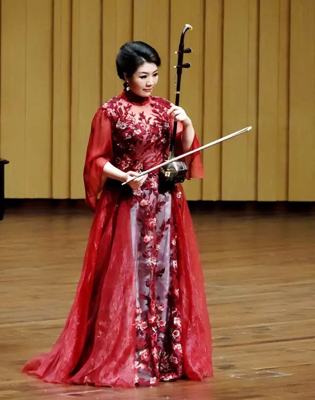 音乐会下半场,宋飞教授身着红色华服惊艳亮相,将一首近代二胡优秀作品、气势磅礴的《江河云梦》倾情挥洒于乐曲天地之间。