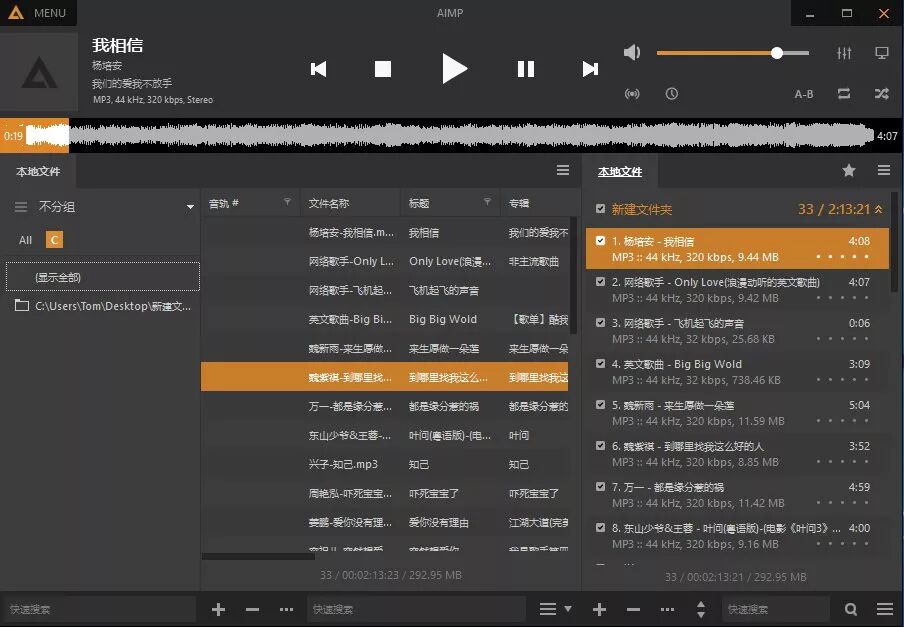 AIMP 4音乐播放器的操作界面,乍一看界面似乎有点像以前流行的经典音乐播放器Winamp,不过看起来比 Winamp 更有质感一些,所以您完全不用担心无法很快上手的问题。AIMP 4提供了2款主流的皮肤面板、具备 18-band 的声音均衡器、可视化的窗口可以以多种视图显示节奏的动态效果、播放列表功能可更方便地编辑和管理您的音乐文件等等。