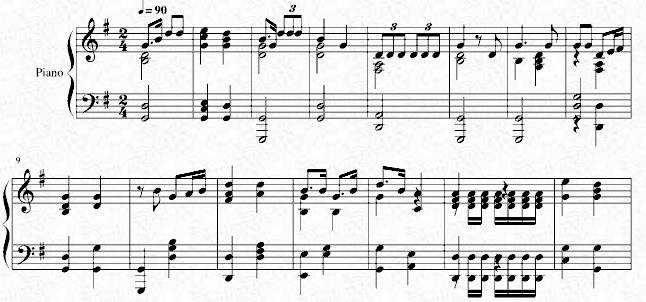 谱例七:进行曲类《义勇军进行曲》