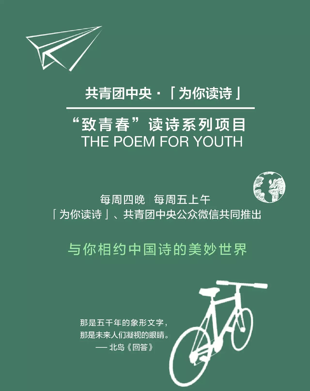 2016年,中央联手Be My Guest「为你读诗」共同推出“致青春”读诗系列项目,邀请各领域、各年龄段给青少年带来正能量的人士参与读诗,以诗的语言、以阳光的态度,与我们在这个春天重温中国传统经典。期待以年轻的朝气,开启诗意生活的新篇。