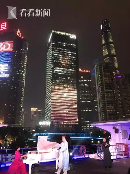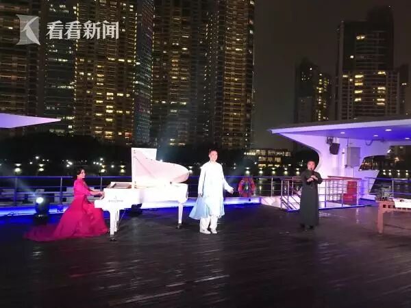 这里就是浦江生活节系列活动当中,非常有意思的东西方不同艺术表现形式的融合表演,名为《春江花月夜》,艺术家们通过现代的艺术表现形式,将传统的艺术进行跨界融合,钢琴声中有昆曲,书法挥墨之中有笛箫。钢琴由美籍钢琴家汤蓓华和昆曲王子张军担纲,在翡翠公主号上,与美丽的浦江夜色一起为观众呈现精彩的演出。