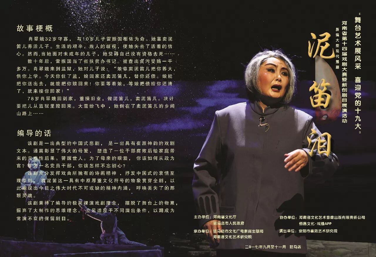 豫剧现代戏《泥笛泪》由编剧、导演李云,导演李晔飞,作曲配器李素奇、张现增,舞美设计吴放、杨强等主创。崔小田领衔主演(饰肖翠娥),主要演员有任现军、薛曼、徐凤、杨少龙等。《泥笛泪》是一出典型的中国式悲剧,彰显了豫剧崔派艺术特色,歌颂了伟大的母爱。该剧充分发挥戏曲所特有的诗画精神,将泥笛这一具有中原厚重文化符号的物象贯穿全剧,以泥笛代初心、代根本,警示世人不忘初心,不可忘本。