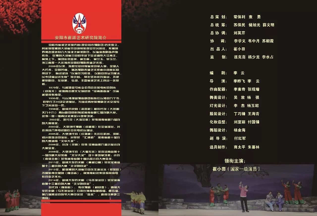 安阳市崔派艺术研究院,原安阳市豫剧团,最早可追溯到豫剧大师崔兰田1950年创办的西安兰光剧社,以擅演悲剧闻名。60多年来,在继承、弘扬崔派艺术上创出一条新路,涌现出张宝英、崔少奎、崔兰玉、辛玉兰、孙兰香等一大批豫剧表演艺术家,创排了《洞庭秋》《大路朝天九十九》《大渡壮歌》《故道情》《红旗渠》《大爱无言》《曹操立嗣》《野牯岭》《柳迎春》《马丕瑶出京》等优秀剧目。其中《包青天》《柳迎春》先后被搬上荧幕;《故道情》被拍摄成电视剧在中央电视台播出;《红旗渠》获第九届河南省戏剧大赛文华大奖;《大爱无言》获第十届河南省戏剧大赛文华大奖;《野牯岭》《柳迎春》《马丕瑶出京》分别在河南省第四届、第五届、第六届黄河戏剧节大赛中获金奖。