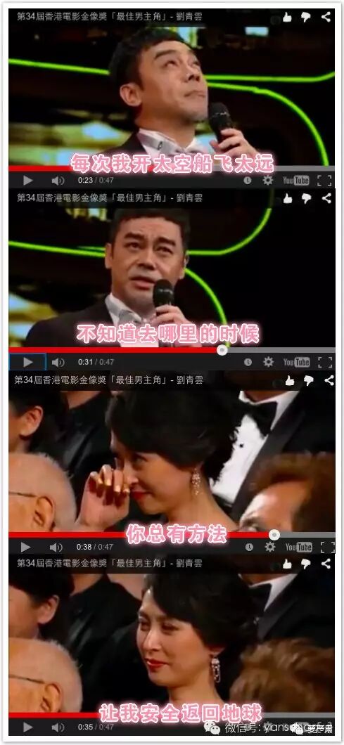 当然刘青云夫妇的恩爱事迹也很多,甜甜蜜蜜十几年,但我印象最深是2015年金像奖这个告白,浪漫又有想象力,刘青云是个诗人啊。