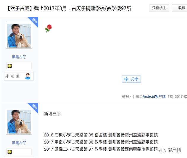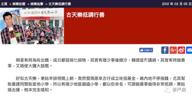 近年古仔低调行善,几乎每个月都有向本报的慈善基金捐钱帮助有需要人士,而他的慈善基金在内地建学校,他一直是秘而不宣,但昨日有网友扬其善举,列出这3年多来,已经有几十间中、小学以他名字命名。