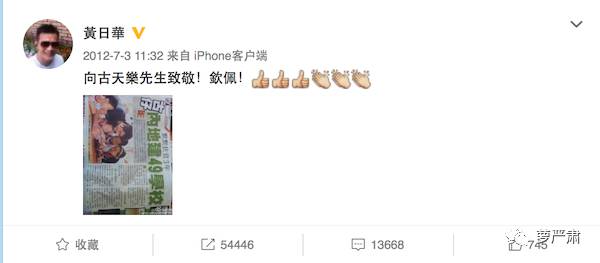 这个报道被黄日华发现,拍照传上微博,说要向古天乐致敬,在2012年就收获了五万多转发。