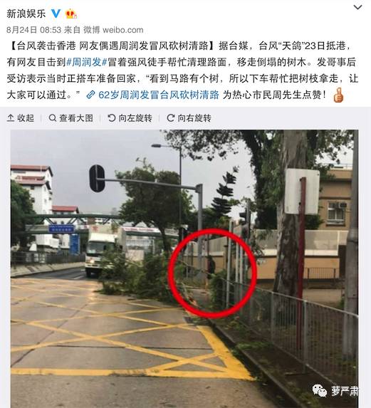 跟娱乐新闻有关系的就是:有香港网友目击到,周润发在强风 中徒手清理路面,移走倒塌树木。
