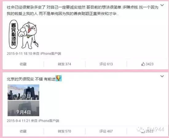 陈奕迅早前一直用的小号“吹神”混迹在微博,直到后来公司给他注册了大号,主要用来分享工作上的事。