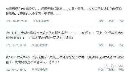 李炜的小号就比较惊人,内容上全是对天娱、经纪人的不满,甚至还吐槽说天娱高层不是Les就是Gay。