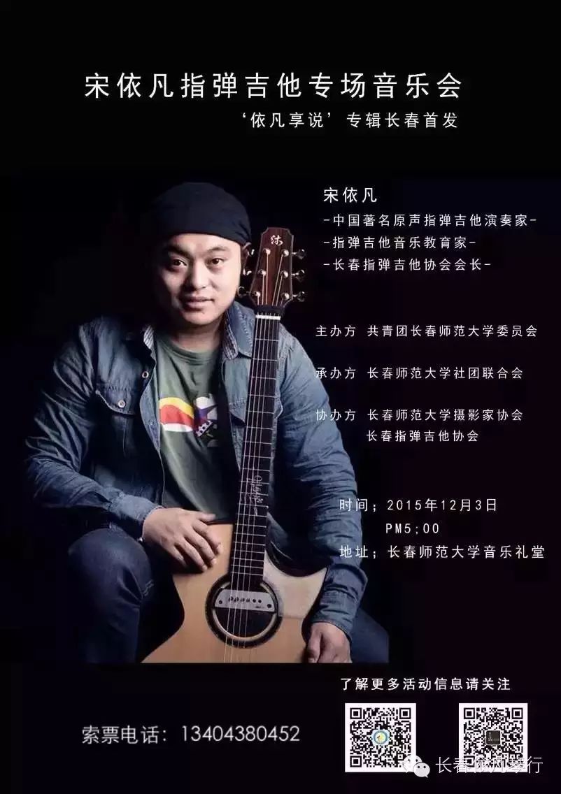 2015.12.3 PM5:00 宋依凡指弹吉他专场音乐会《依凡享说》原声音乐专辑长春首发 ,将在长春师范大学(东环城路与长吉北线交汇) 音乐礼堂开幕,感谢各位好友与粉丝的支持!