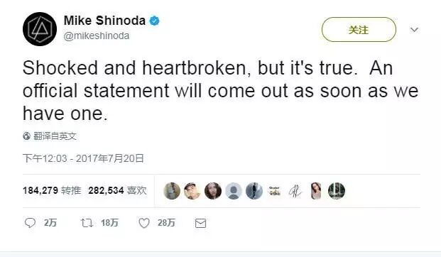 林肯公园元老成员Mike Shinoda也发文称,“既震惊又心痛,但是消息千真万确。官方声明一旦完成会立刻发布。”