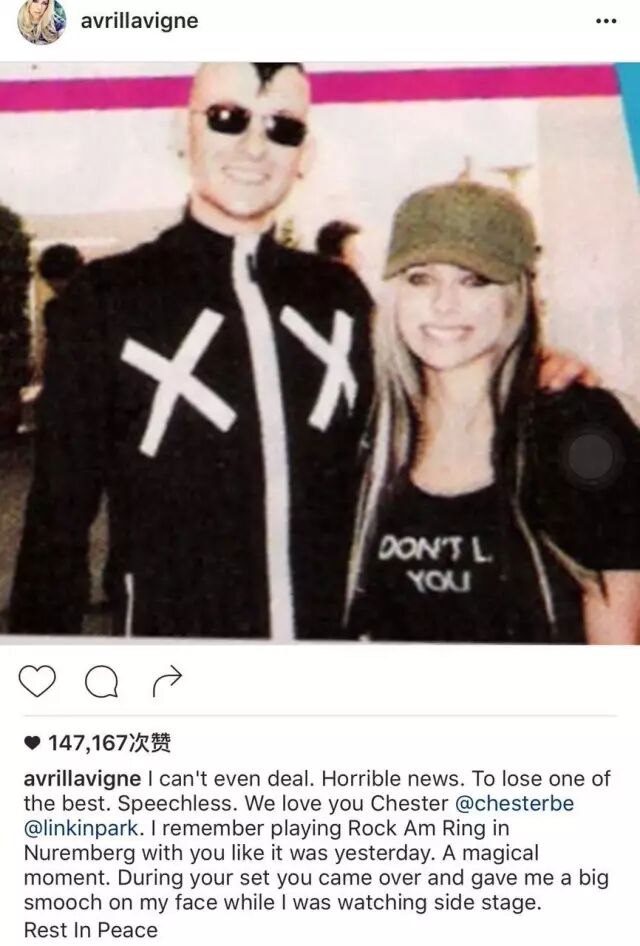而同是一代人青春的艾薇儿也发INS悼念,“真的不敢相信,如此悲伤的消息,当年我们在德国纽伦堡的演唱会仿佛就在昨天......"