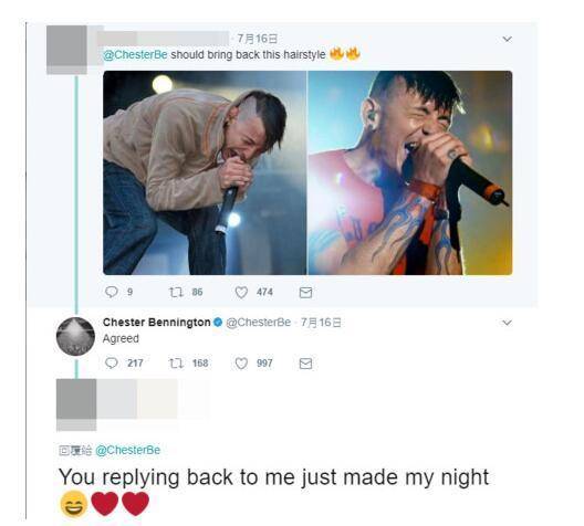 Chester在网上最后的留言,是5天前和歌迷在推特上的互动。林肯公园其中一名粉丝曾上传2张他的照片,并写下留言“希望你能留回这个发型”。