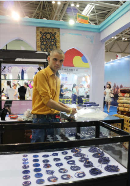 阿富汗馆,异域帅哥以及他身后颇具盛名的阿富汗地毯,用羊毛织成,色彩迷人。