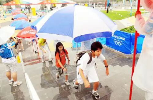 2008年8月10日,北京突降大雨,观众从志愿者用伞连成的“长廊”下走进北京工业大学体育场观看羽毛球赛。