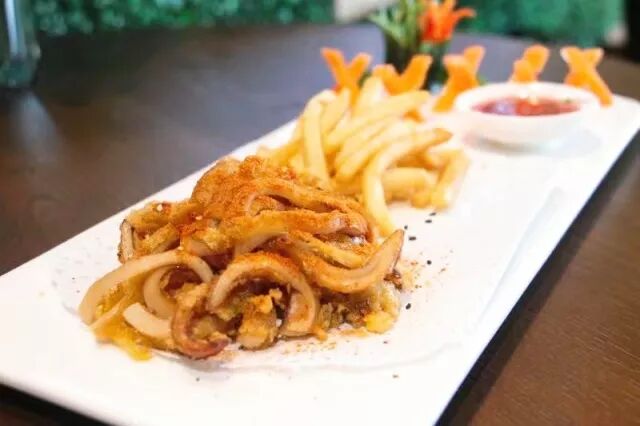 切成小段的墨鱼经过炸制之后,色泽金黄诱人,因为火候的把控,所以并没有那种被油浸的感觉,内里依旧保持了肉质的鲜嫩。