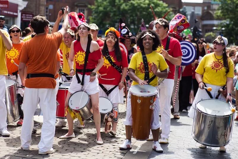 桑巴音乐以华丽、激昂、明亮、节奏超快著称,在桑巴打击乐里面,我们经常会听到许多不同音高、不同音色的“叮叮咚咚”声。其实是这些“叮叮咚咚”的声音是由很多种不同的乐器组合而成的,桑巴打击乐的魅力之一,就在于——它是由团队合作完成的作品,每个人享受旋律和节奏当中的快乐是发自内心的~