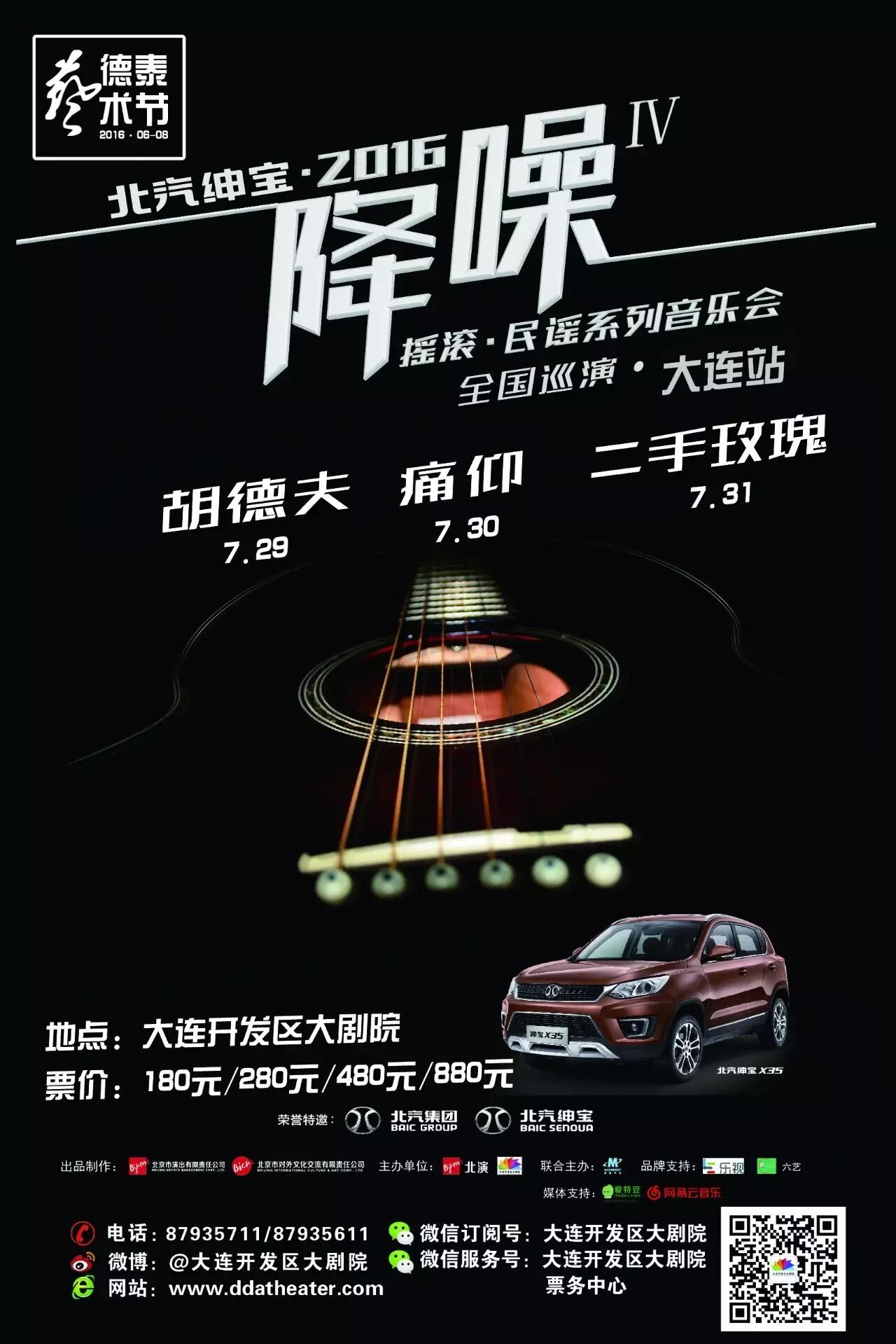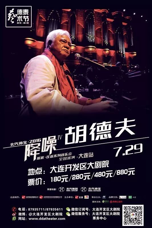 由北京市演出公司主办的“北汽绅宝—2016降噪Ⅳ摇滚•民谣系列音乐会”即将于7月29日、30日、31日登陆大连开发区大剧院。胡德夫、痛仰乐队、二手玫瑰,三天三组音乐人的三个专场演出,将在这个夏天为所有喜爱摇滚、民谣音乐的朋友带来一剂专属降温贴。