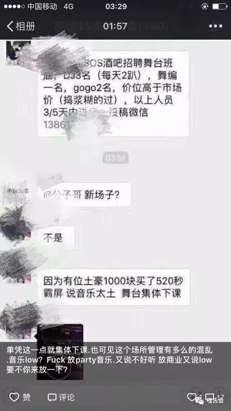 首先为这家酒吧舞台部的艺人们打抱不平,我明白夜店舞台部的规矩,为了新鲜感会定期更换舞台艺人,可是就因为这样一条霸屏信息全体被下课,凭什么?请问酒吧管理层,你们在想什么?有没有想过这条霸屏信息可能是来自你家酒吧竞争对手?或者是来自某个客人的恶搞?我只想说,这个决定太草率了!