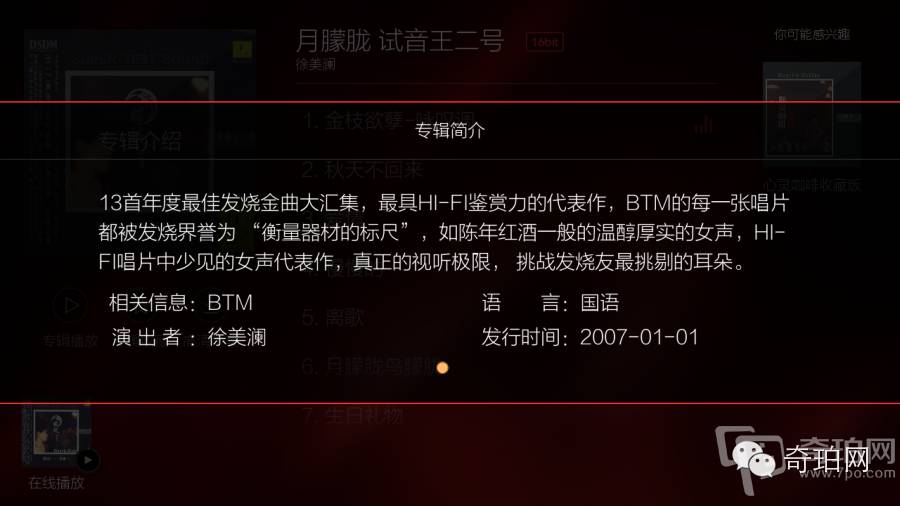HiFi音乐是一款极精致的家庭客厅音乐应用,我们精选艺术价值高、录音效果好的音乐专辑,配合精美封面、详细专辑介绍,为所有音乐爱好者提供超越MP3媲美CD音质的高保真流媒体音乐服务,更为音乐发烧友提供母带级音质的高解析音乐下载服务,用户可以通过家庭智能电视、智能机顶盒自带的遥控器极其便捷的搜索、选歌、播放、下载,并可微信一键分享给好友,界面精美,内容丰富,音质纯净,配合您的音响系统,体验全新HiFi级音乐享受。