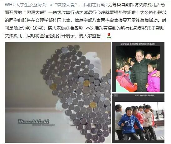 活动理念:“微源大爱”活动,最先由武汉大学大学生公益协会内部人员提出,以募集零钱的形式进行,旨在校园内传播一种“微公益”“人人公益” 的理念。