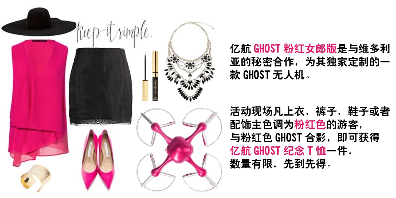 粉红色的GHOST是亿航特意为维多利亚秘密合作而特别定制的,当天来到草莓音乐节上海站的朋友,只要您身上主色调的配色为粉红色,并与GHOST合影,即可获得亿航GHOST的纪念版T恤衫一件,数量有限,先到先得。