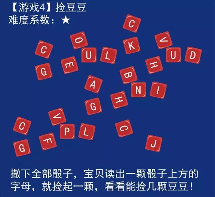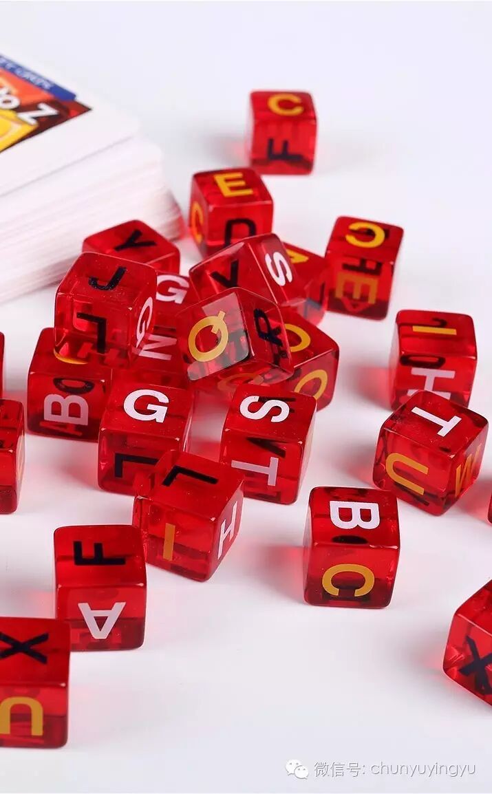 一共26颗骰子,每个筛子6面,所以每个字母都可以找到6次,基本可以拼出所有英文单词。