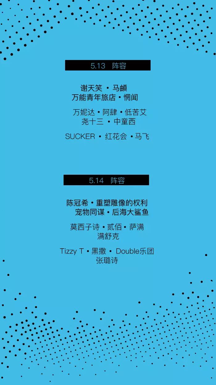 阵容:陈冠希、红花会、黑撒、马飞,谢天笑、后海大鲨鱼、马頔、阿肆、莫西子诗、贰佰、万妮达、Tizzy T、万能青年旅店、重塑雕像的权利、宠物同谋、惘闻、低苦艾、尧十三、萨满、满舒克、中童西、张璐诗、SUCKER、Double乐团...