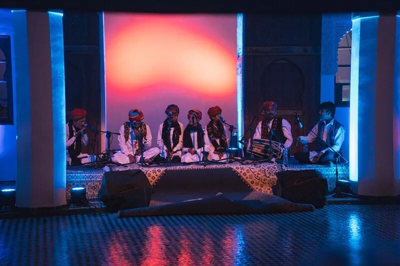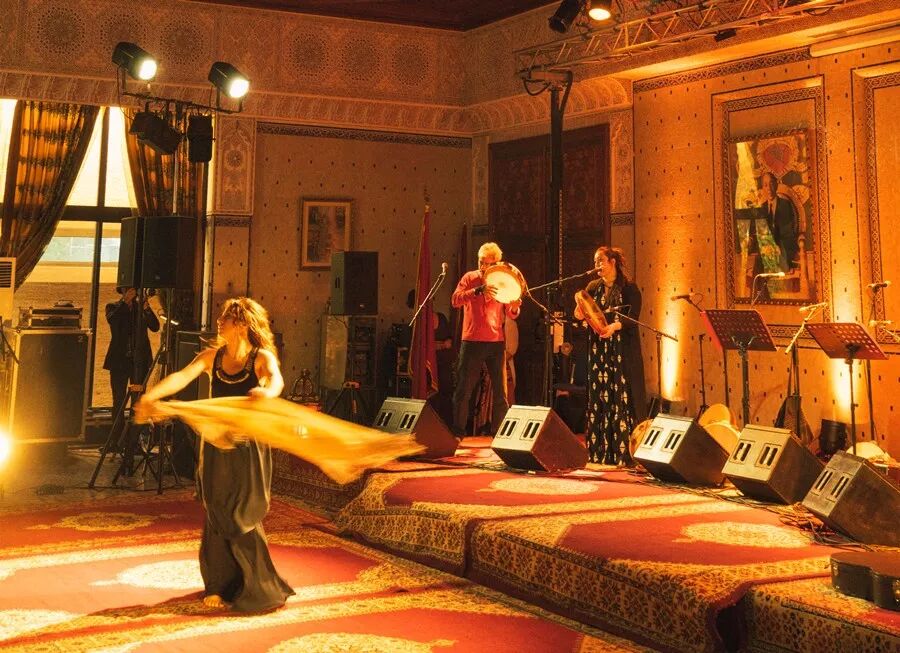 晚上11点半,菲斯老城,市政宫昏暗的舞台上,演出正进入高潮。一位来自孟加拉的女流浪歌手,一手弹奏手中的Ektara乐器,一手拍打着腰鼓。绑在脚踝上的铃铛随着舞步叮铃作响。她的身体飞速地旋转,那些长及腰身的发束失去重力,像一把开在她头上的伞。舞台的另一侧,一个身着苏菲修士服、下巴蓄着山羊胡子的格纳瓦(Gnawa)男乐手席地而坐。他的身子侧向她,手里不停地拨动一种叫做Gimbri的乐器,摩尔人的低音吉他。女子的歌声清冽悠远,咏唱的是印度湿婆神的故事,而男人的琴声浑厚,口中吟诵的,是来自阿特拉斯山脉的诗歌。在他们身后,是一幅巨大的摩洛哥国王六世画像。