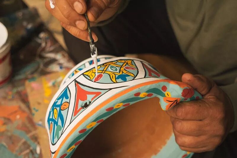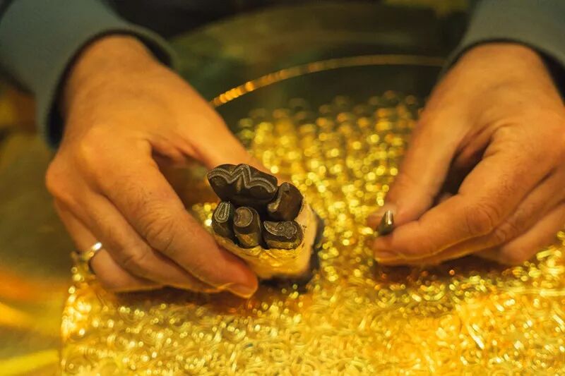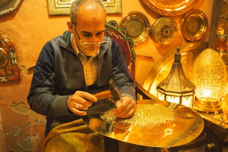 正因为浩然淡定之气,还是有很多古代菲斯人享受的东西,被继续保留下来。人们喜欢听院子里喷泉的水溅落在花砖上的哗哗声,也喜欢听给火钵上添加檀香或者安息香时,炭火上发出的噼啪声。黄昏中,人们总喜欢坐在一个较高的地方俯瞰老城,看着成群的北非鹳绕着城门打转,注视着灯光、颜色和地平线随着夜幕降临中慢慢地变化。他们喜欢满足自己的感官:香水、金属镂刻、五颜六色的布料。