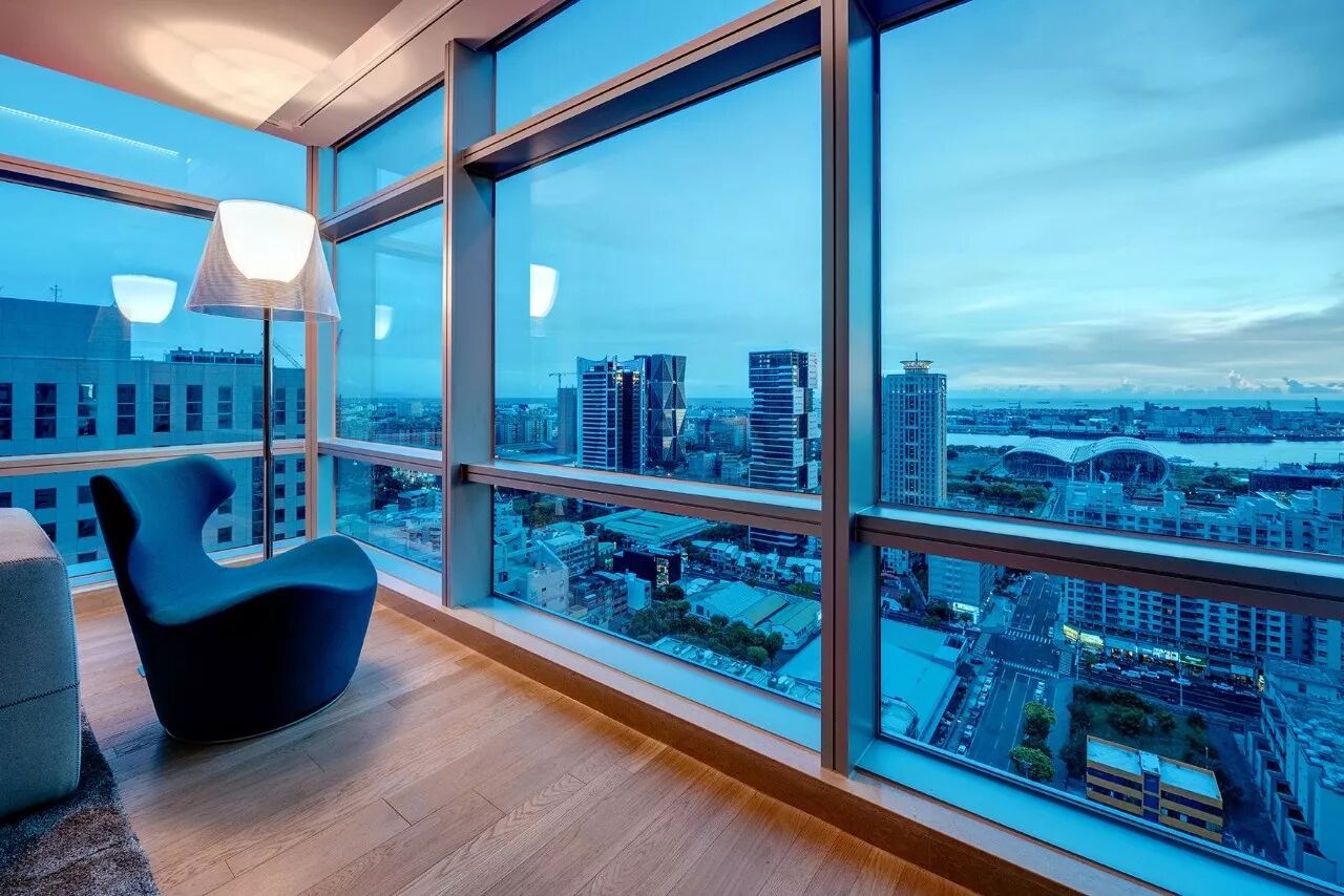 正对床的落地玻璃将高雄的市区景观收入房中。