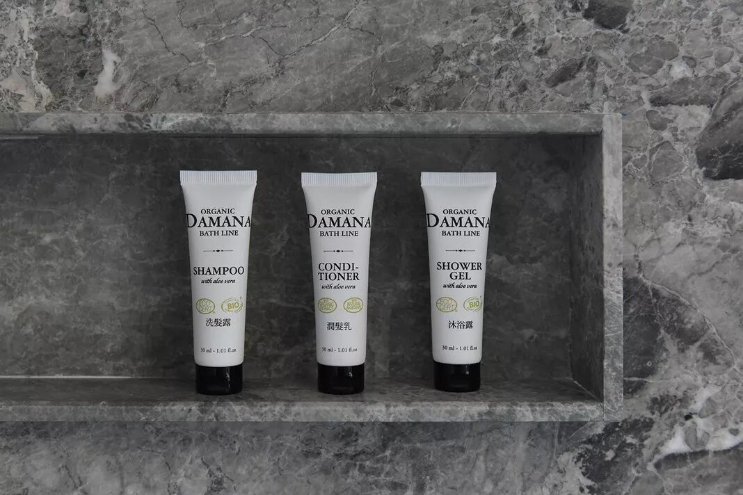 双人洗手台全部独立,备品用了欧盟有机认证的 Damana 系列,不过在国内知名度不高。