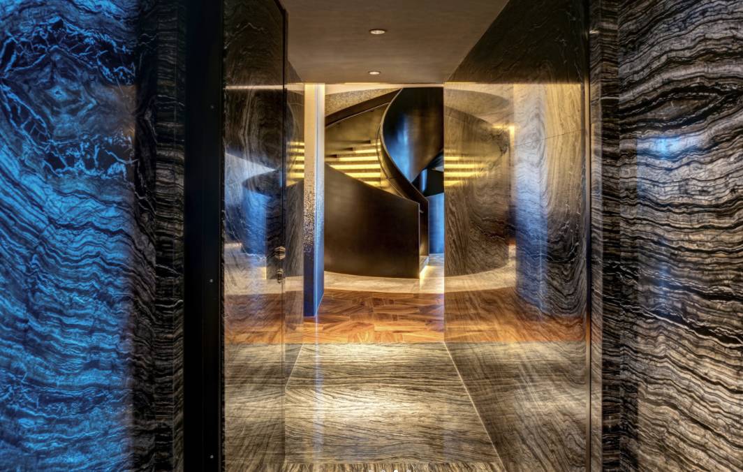 卫浴空间与衣帽间连通,所见之处几乎全以木材与云石混搭而成。