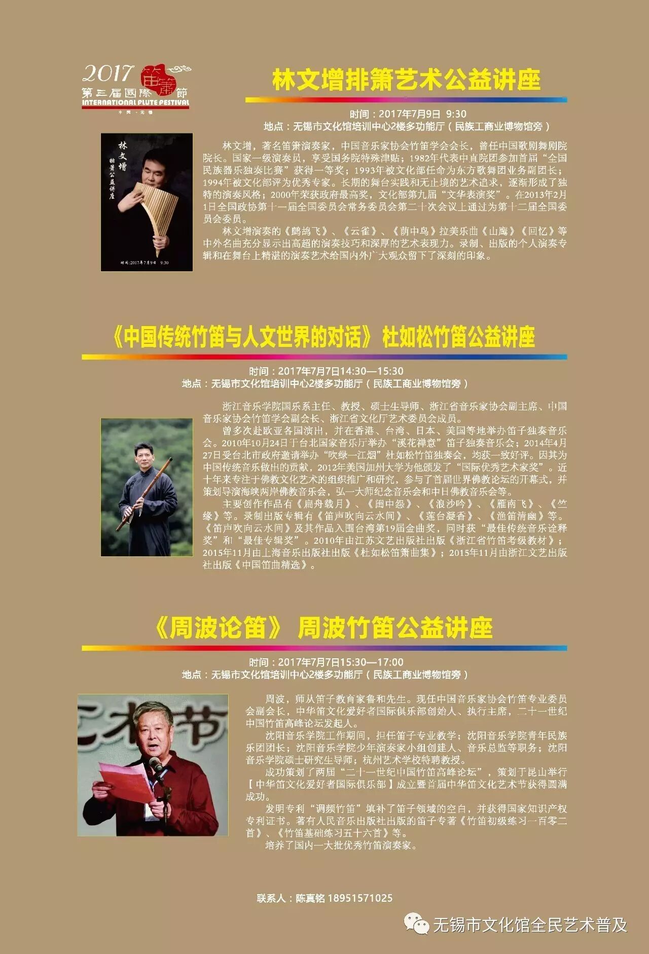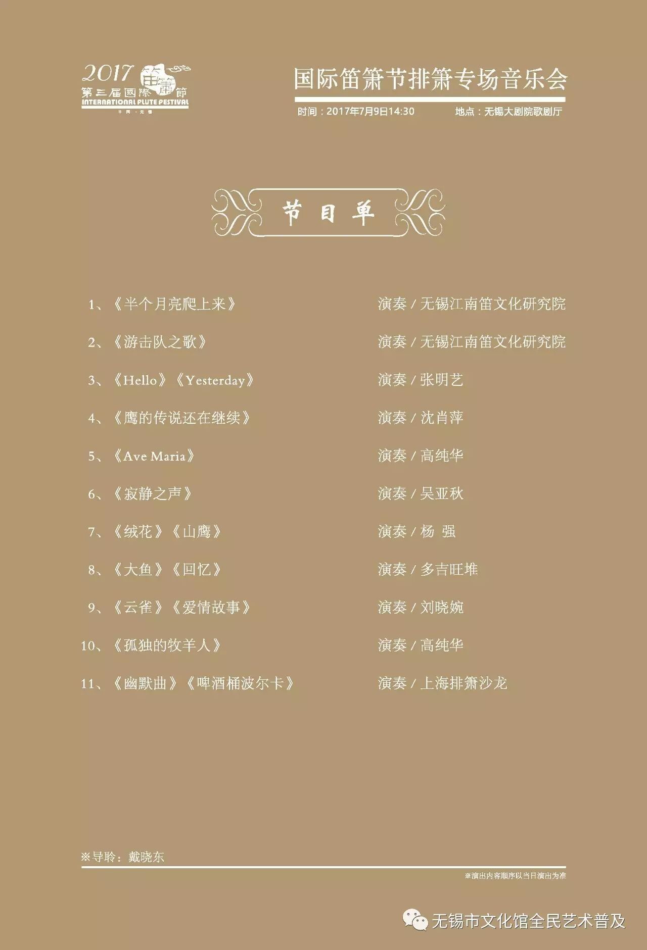 其他广大笛萧爱好者(限额50名,先到先得)需至无锡市文化馆文艺普及部登记报名。