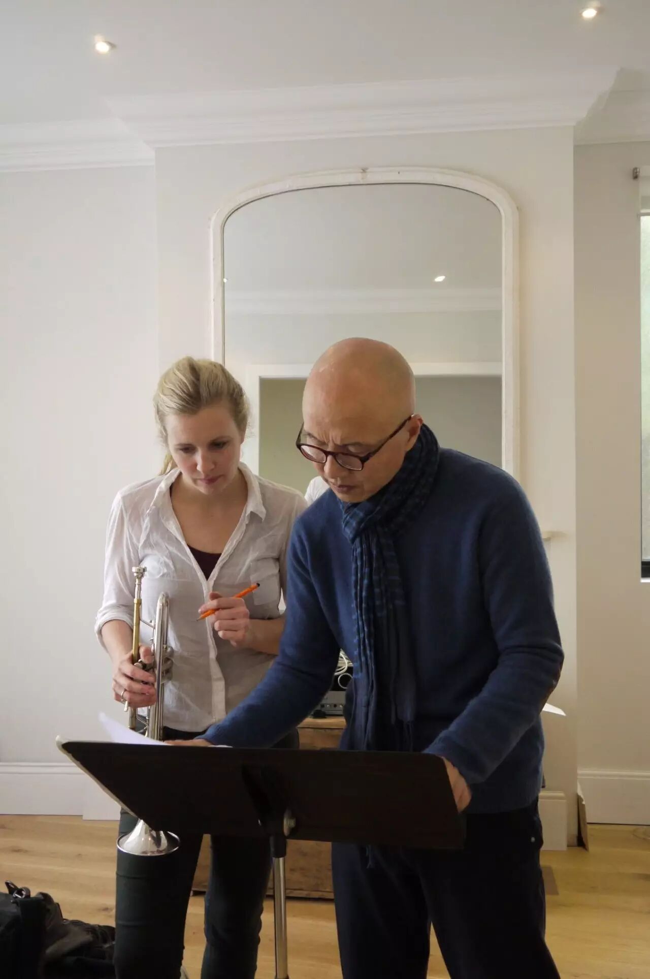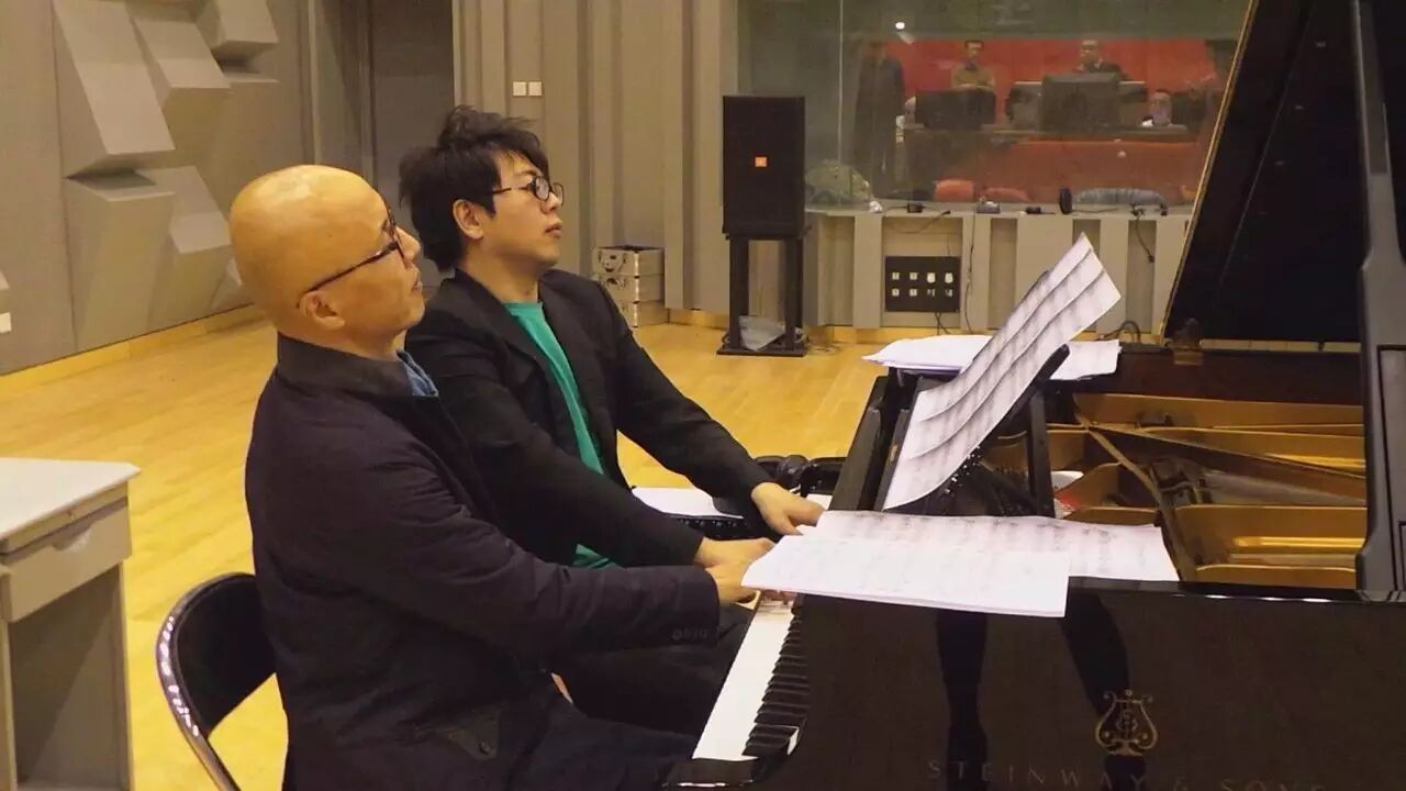 2014年 小号协奏曲“万年欢”首演,陈其钢与英国小号演奏家Alison排练,这首“万年欢”,寄托了陈其钢对爱子雨黎的怀念,欢乐的名字里藏着深沉的哀思