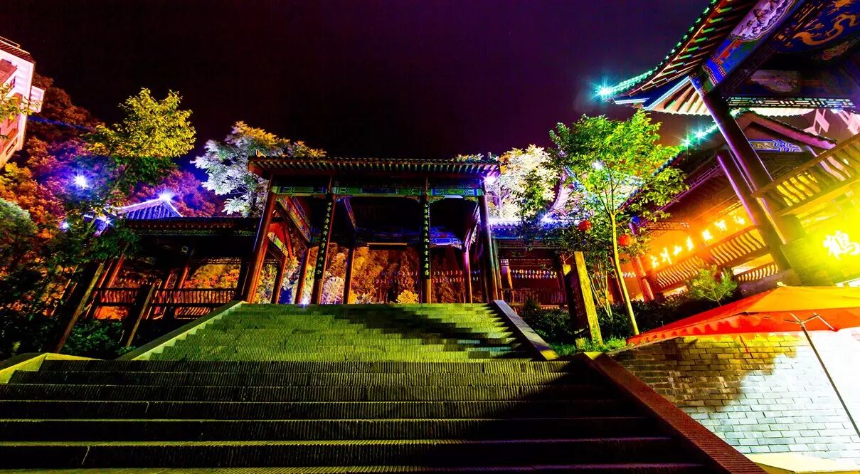 用石块铺砌的台阶两端都有灯光照明,走起来倒也稳当,台阶一旁还有扶手,夜游绝对安全。