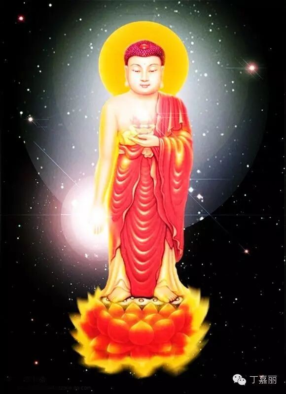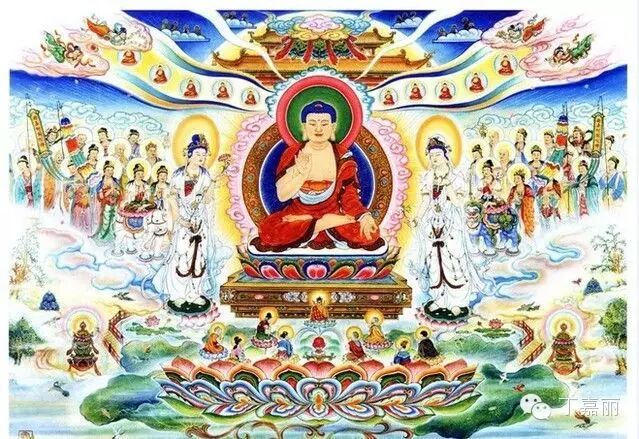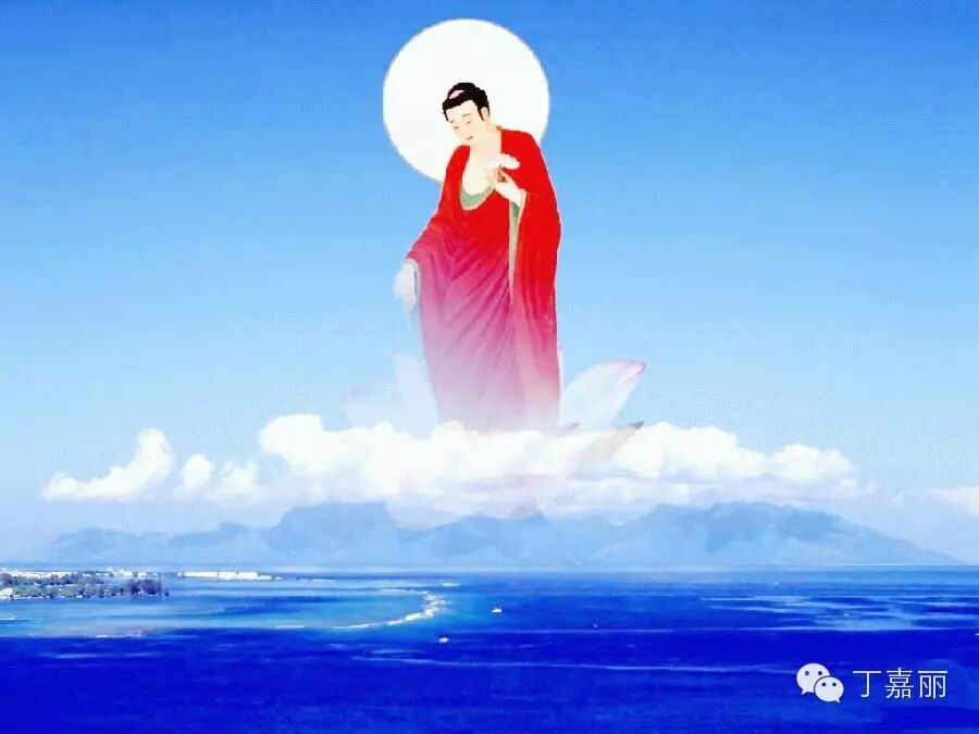 孩子!你久劫奔波已经忘记了家乡的模样了吧?家乡这里无比美丽庄严,黄金铺地,七宝池、八功德水,充满其中,池底纯以金砂铺地,池中莲花大如车轮,青色青光、黄色黄光、赤色赤光、白色白光,微妙香洁。四边阶道,金、银、琉璃、玻璃合成。上有楼阁,也用金、银、琉璃、玻璃、砗磲、赤珠、玛瑙而严饰之。家乡的宝树是七宝所成,树高四百万里,树叶四布二十万里,微风絮絮吹动,宝树发出无量妙法音声,大家听了,耳根清彻,内心无比清净,没有苦恼。音乐的殊妙超过天乐亿万倍不止,树中还能映照出无量庄严的他方佛土世界。
