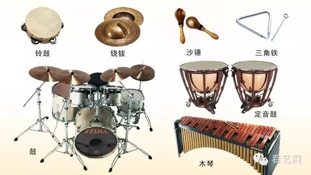 定音鼓、大鼓、小军鼓、钹、架子鼓、三角铁、沙槌、钟琴、木琴、排钟等。打击乐器是乐器家族中历史最为悠久的一族了。其家族成员众多,特色各异,虽然它们的音色单纯,有些声音甚至不是乐音,但对于渲染乐曲气氛有着举足轻重的作用。通常打击乐器通过对乐器的敲击、摩擦、摇晃来发出声音。可不要认为打击乐器仅能起加强乐曲力度、提示音乐节奏的作用, 事实上,有相当多的打击乐器能作为旋律乐器使用呢!现代管弦乐队里增加了很多非洲、亚洲音乐里的 音色奇异的打击乐器,几乎无法完全罗列。