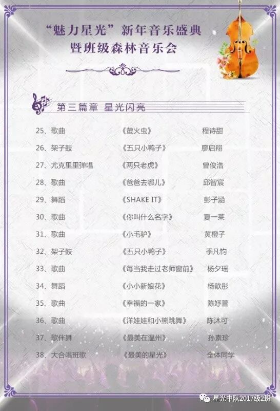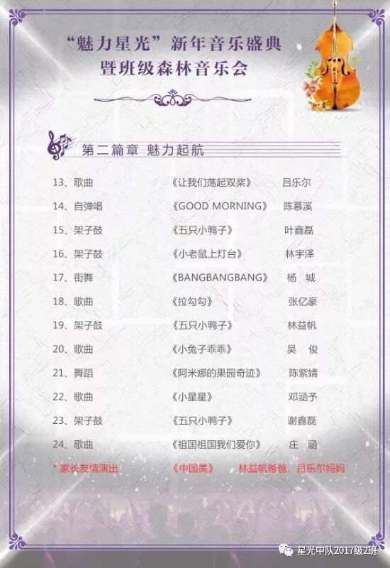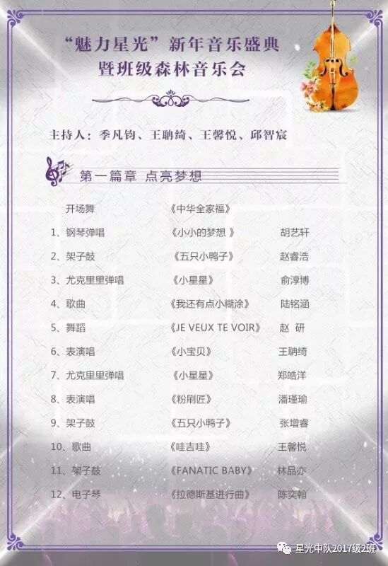 转眼间一学期很快结束,在过去的四个月里有欢笑有泪水,有成功有挫折,但更多却是因孩子的快乐成长而心生的喜悦。为了积极响应学校要求班级开展自己的音乐会,让每个孩子都有上台历练的机会,我们星光中队将开展班级音乐会,,保护每个孩子独有的世界,激发他们的潜能无限可能,让他们成为最好的自己。特定于2017年1月3日下午13:30邀请我们的家长和同学朋友们,以及一直默默支持和关注我们星光的学校领导们、老师们莅临参加“魅力星光”—新年音乐盛典暨班级森林音乐会。现场每个孩子都是舞台焦点,还有家长友情演出,更有我们班主任孙老师首次亮相演唱歌曲,赶快互相转告身边的同学家长们一起参加吧!我们将以饱满的热情期待您的光临。