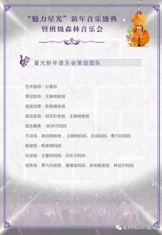 4、星光中队已安排专业摄影师(胡艺轩爸爸为同学们拍照,本次音乐盛典的策划宣传、视觉呈现王聃绮爸爸会对本次新年音乐盛典进行全程录制,后期公众平台推送,如果家长需要为孩子拍照,请在座位上拍照,避免影响拍摄效果,以及遮挡孩子和其他家长视线。