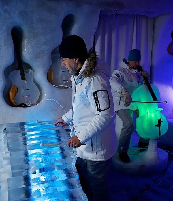 在过去的15年中,瑞典艺术家Tim Linhart每年都会为他的“冰音乐”大合奏雕刻小提琴、中提琴、大提琴和吉他马林巴琴。每一件乐器都需要花费他一周的时间才能雕刻完成。除了古典名曲,他们还会演奏乡村音乐及蓝调。因为场馆内的温度总是保持在零下5摄氏度,所以听众们会被建议穿暖一点过来……