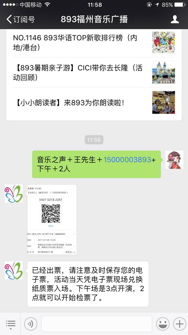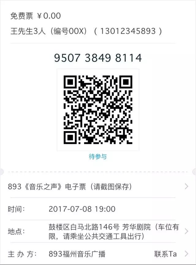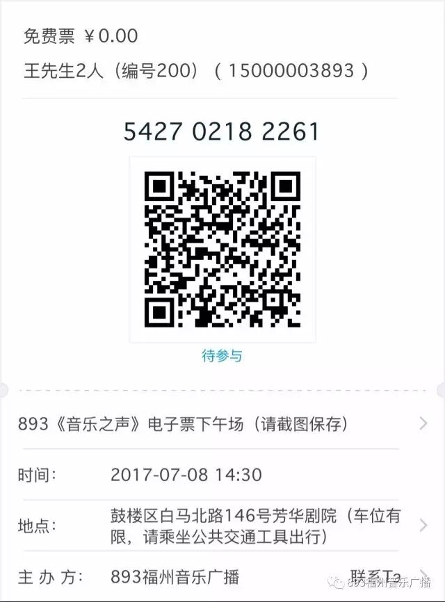 收到893回复的二维码后,若临时有事无法前来观看,请及时在微信公众平台说明情况,并提电子票编号(编号在电话前面)