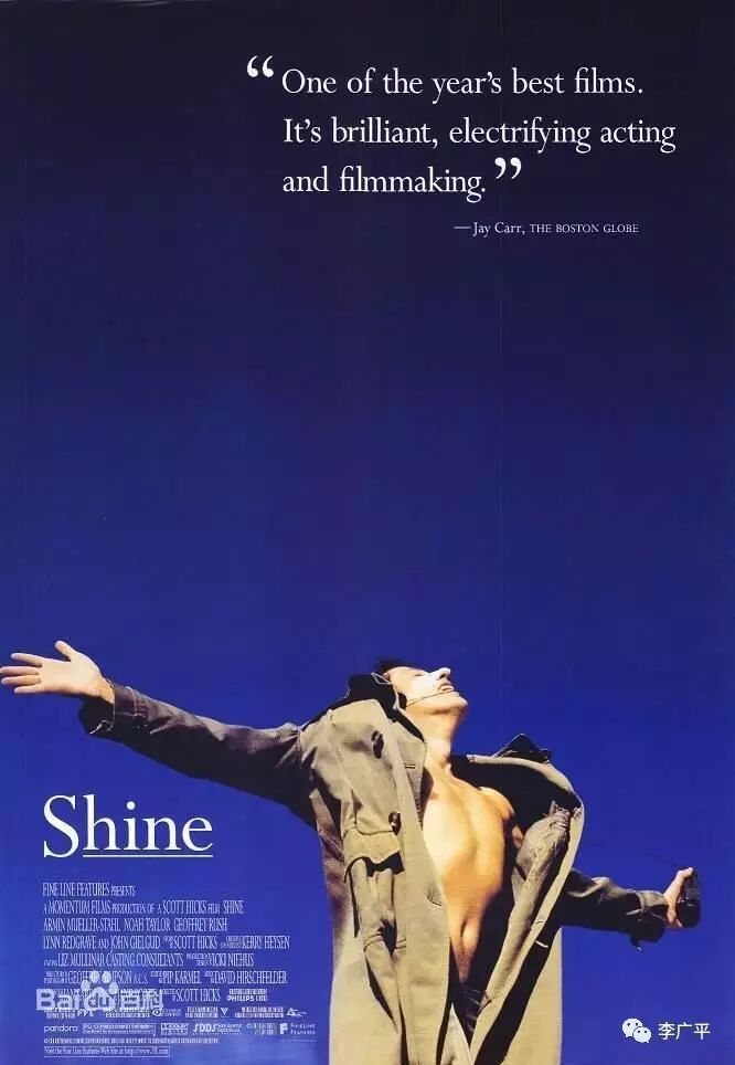 8、《Shine》(闪亮的风采,拍摄于1996年):《闪亮的风采》是由斯科特·希克斯执导,杰弗里·拉什、诺亚·泰勒主演的剧情片,于1996年8月15日在澳大利亚上映。该片根据真实事件改编,讲述了钢琴家大卫·赫夫考所经历的生命悲欢与情感挣扎。1997年,杰弗里·拉什凭借该片获得第69届奥斯卡奖最佳男主角奖。澳大利亚钢琴演奏家大卫-赫尔夫高特的令人唏嘘的故事影片。