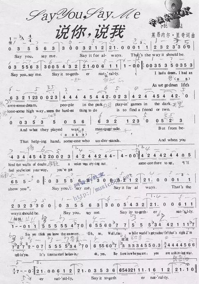 世界名曲《Say you say me》1985年由莱昂纳尔·里奇(Lionel Richie)谱写,同时由其担任主唱。 作为电影「飞越苏联」《White Nights》的主题曲。电影叙述一位原苏联芭蕾舞男演员和一位美国黑人踢踏舞演员在策划出逃时结下的友谊。这首歌是在影片结束时唱的。相比电影本身的默默无闻,作为主题曲的《Say you say me》却是享誉世界。
