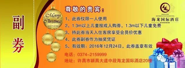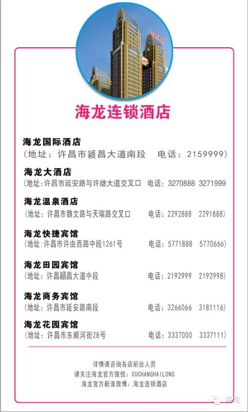 售票地点:海龙国际酒店、海龙连锁酒店各分店 预定热线:0374-2159995/2159999