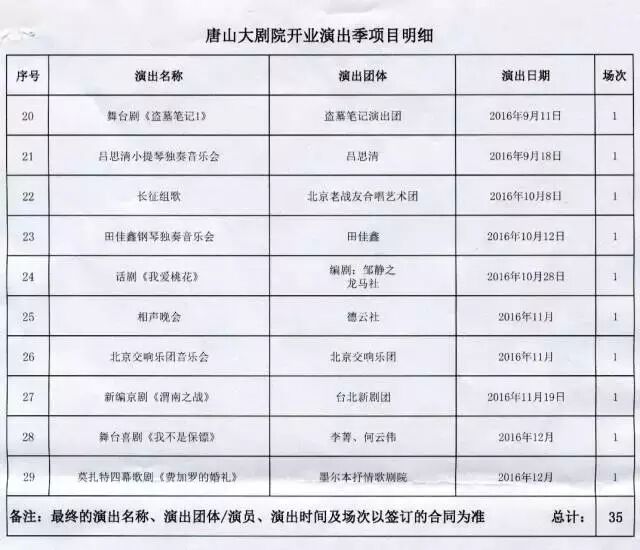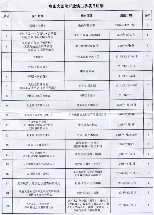在6月3日的正式演出中,第一场是由“中国一流,亚洲前列,世界著名”的中国爱乐乐团带来的《中国爱乐乐团音乐会》;“国粹就在你身边”由中国国家京剧院带来的现代京剧演唱赏析音乐会;在9月,我们将收获备受关注的舞台剧《盗墓笔记》;10月演出的话剧《我爱桃花》也是备受广大观众喜爱的话剧之一;受全国观众喜欢的德云社也将在11月登陆唐山大剧院,带来《相声晚会》等等。