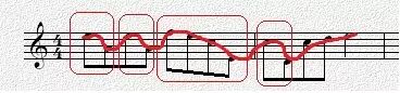 上图中的乐谱便是乐曲的开头部分。这首乐曲的重要动机便是下行的大跳音程,如此开头是从mi到la的下行五度。到了第二小节,更是有七度的下行音程,如此频繁的大音程下行在旋律中非常少见的。起到什么作用呢?现在我把音符连起来,如下图所示。