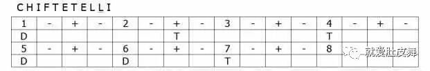 这个节奏起源于土耳其,是土耳其风格中东舞常用的节奏之一,现在的部落融合风也经常使用,8/4拍的节奏与2/4,4/4拍节奏相比较情绪会更加缓和、粘连。Chiftetelli这个节奏如果拆分成前后4拍两部分来观察就会发现前4拍类似于放慢速度的Malfouf。观察3个重音的点位,感觉就像放慢的Saidi,温柔放松的同时又向前推进的力量。