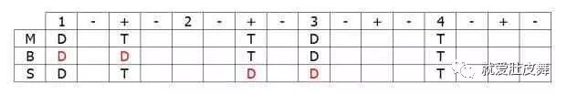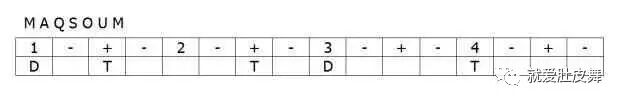 这三个4/4拍的节奏都属于Maqsoum家族,不仅体现在都是4/4拍类型,把他们纵向排列就会发现,他们的点位对应整齐,区别只在个别点位上的音色而已(如下图)。